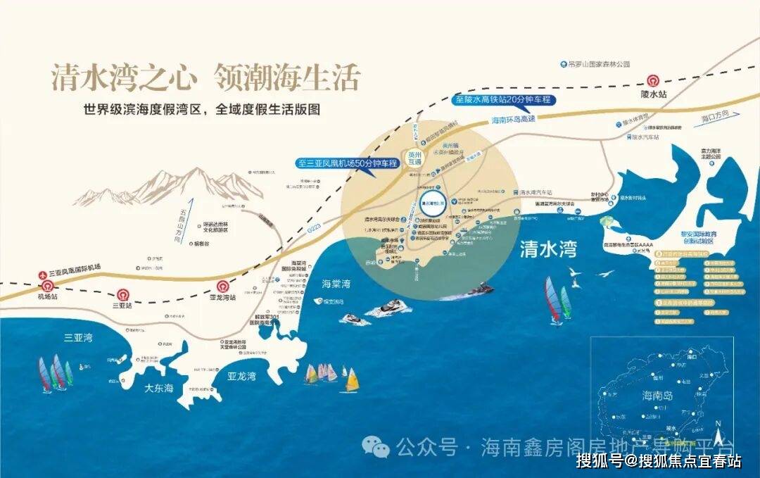 项目地处北纬18°以南,距三亚市区直线公里,尊踞大三亚醇熟生活圈;位于清水湾度假区中央核心,坐拥清水湾万亩文旅醇熟配套,紧邻陵水黎安国际教育创新试验区,致力于打造清水湾片区产品标杆。